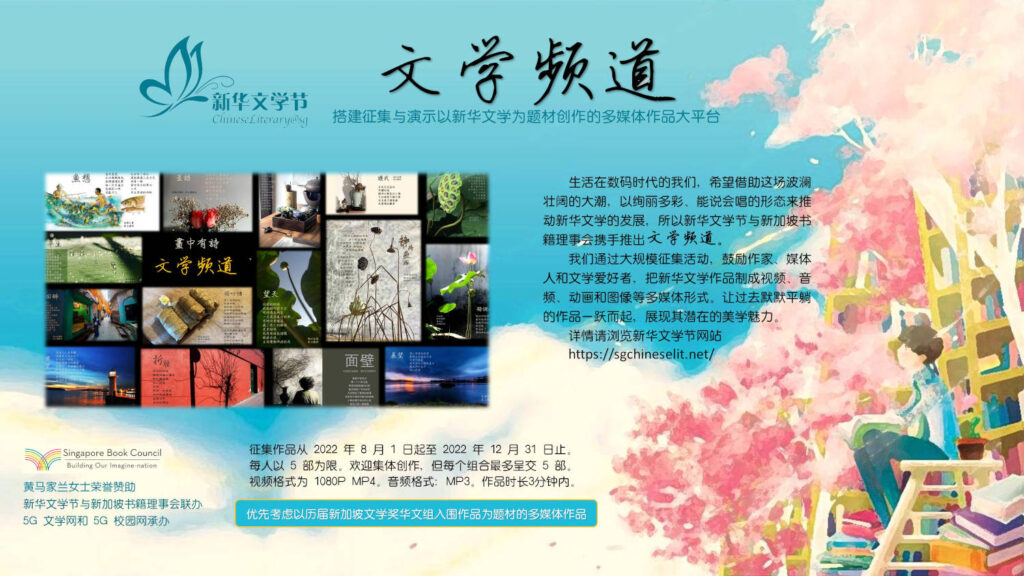 多媒体作品演示厅随着网络科技的神速发展,各类多媒体音像媒介也日益普及,我们希望能借助这场波澜壮阔的数码大潮,以绚烂多彩、能说会唱的形态推动新华文学的发展,所以新华文学节与新加坡书籍理事会(Singapore Book Council)携手联办,由5G文学网与5G校园网策划与承办,推出网络平台【文学频道】。